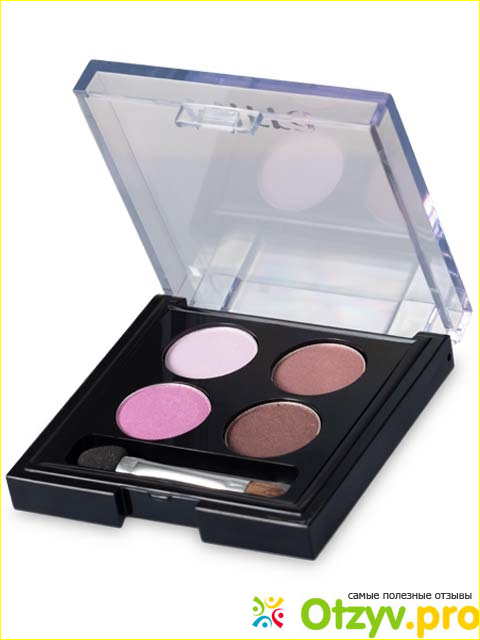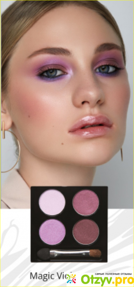 Акцент сделан на фиолетовые, розовые. В наборе 4 цвета, между собой прекрасно гармонируют, не пылят как на кисточке, так и при макияже и нанесении.