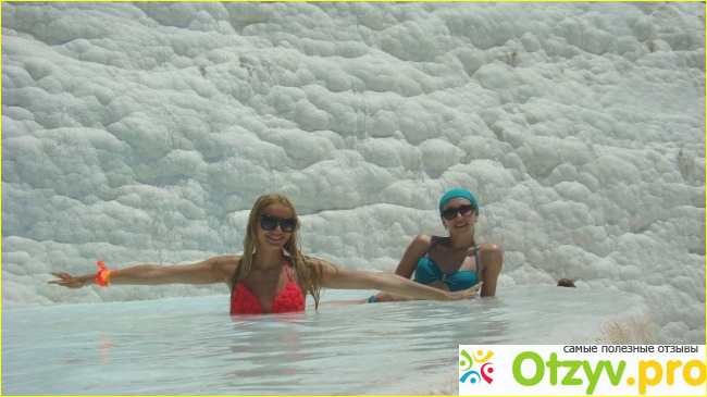 И вот наконец то мы в хлопковом замке, так еще называют место Памуккале. Так вот глубина воды там не такая большая, вода белого цвета, но очень мутная. В любом случае утонуть у вас там не получится, вода очень жесткая и содержит очень много кальция, который полезен для наших костей. Поэтому обязательно не теряйте такую возможность, но знайте больше 30 минут в такой воде находиться нельзя.