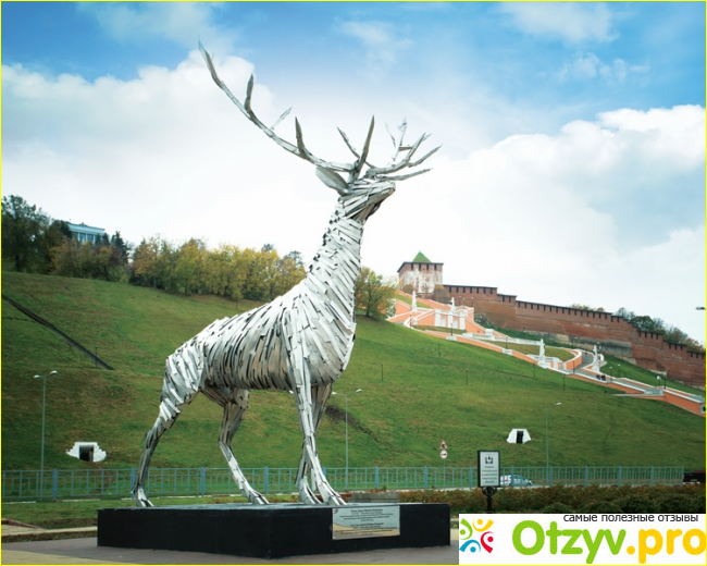 Символом нашего города является олень, и вот совсем недавно было торжественное открытие скульптуры венгерского скульптора. Это произведение искусства - олень создан из металлических пластин, наложенных друг на друга. Теперь олень считается визитной карточкой нашего города, располагается он на нижне-волжской набережной, рядом с Чкаловской лестницей. Очень гармонично они смотрятся вместе и скульптура оленя как раз дополняет краски нашему городу.Еще одна скульптура - подарок от посольства Венгрии - это великан, вылезающий из земли. Возвели такую скульптуру совсем недавно, открытие состоялось 12 июня 2015 года, расположена она на Мещере в микрорайоне Седьмое небо. Зрелище конечно не для слабонервных. Уж очень пугающий вид у этого великана. Не каждый рискнет к нему подойти.