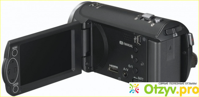 Сзади камеры находится переключатель между режимом съемки видео и фотографий. Под ним прикрепляется аккумулятор. Дисплей управляется кнопками, а не сенсором.