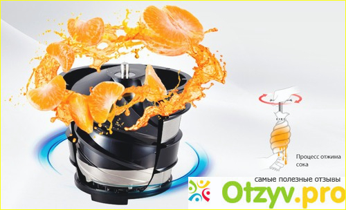 Сок не нагревается и не перетирается, мякоть выходит сухой, носик защищает от пролива после отжима.