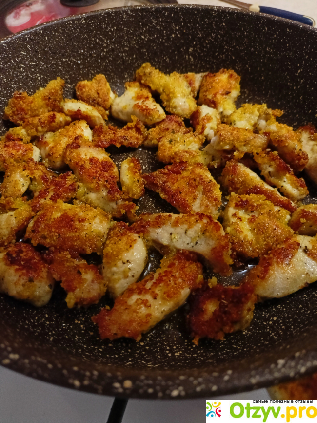 Мясо курицы готовится довольно быстро, пересушивать его не стоит, все же хочется сочности и нежности))). Панировка помогает "запечатать" кусочки мяса и удержать в них достаточное количество влаги.