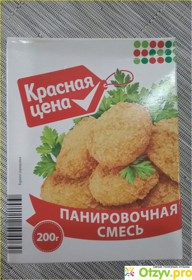 Готовая к употреблению панировочная смесь расфасована по 200 грамм в картонной пачке с характерной расцветкой для данной торговой марки "Красная цена".