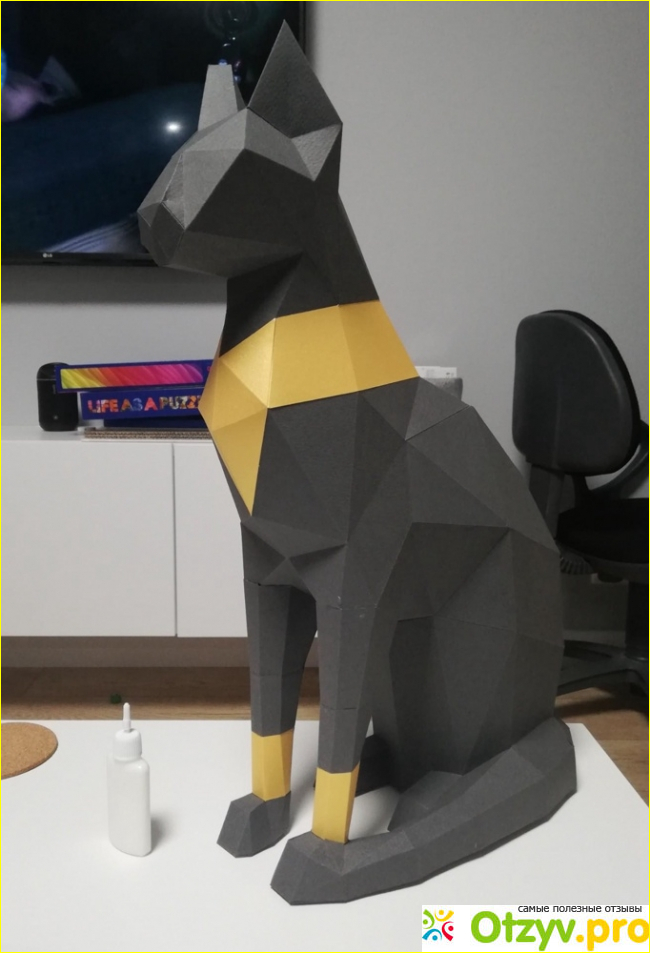Работа заявлена на три часа, но это наверное актуально только для тех, кто уже делал подобные вещи. Для меня это было около шести-семи часов, что для меня было к лучшему, потому что я отлично провела время. Растягивала удовольствие. Мне очень понравилась фактура картона, кошка получилась графичной, объемной. Под разными углами света дает разные оттенки, и интересно рассматривать в разных точках комнаты. Я бы не рекомендовала данный пазл не усидчивым и не аккуратным людям. Заниматься им можно и вдвоем, в том числе с ребенком старшего возраста с приятной беседой. Кошечка у меня вышла отличная, мне не стыдно поставить ее в гостиной на виду у гостей. Возьму на заметку 3д пазлы, и может сделаю такой подарок друзьям или себе.
