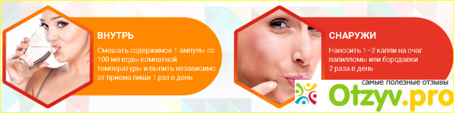Комплекс представляет собой два набора полезных ингредиентов. Для борьбы с папилломами и наростами снаружи используются: