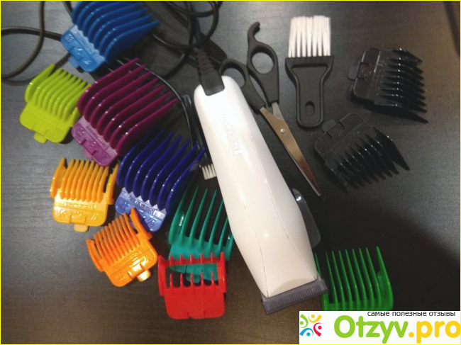 Описание: Корпус машинки пластиковый, белого цвета. Питается от сети 220 Воль. Имеет в комплекте одиннадцать разноцветных насадок, среди которых имеется две очень важные "Косые" насадки (правая и левая) Ещё в наличии есть ножницы, расчёска и две щёточки. Ножи шириной (50мм.) самозатачивающиеся, из нержавеющей стали.