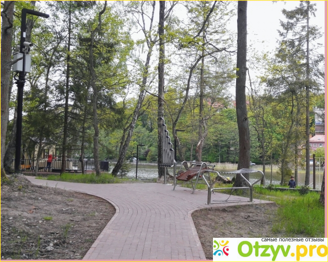 С одной стороны парка находится озеро, а с другой лесной массив с соснами, хвойными деревьями и кустарниками.