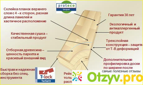 А кроме этого как утверждали продавцы-консультанты в магазине, паркетная доска фирмы Tarkett проста в укладке и надежна в использовании, а также что немаловажно полностью исключает щели, от чего часто страдает ламинированное покрытие. Следует сказать, что слова продавцов оказались правдивыми, поскольку строительная бригада справилась с укладкой ламината в два разы быстрее заявленного строка к тому же они взяли у меня адрес магазина, в котором я купил паркетную доску, хотя вначале отнеслись к моему выбору скептически и предлагали совсем другую фирму. Также стоит сказать о еще одном преимуществе паркетной доски в сравнении с популярными типами покрытия полов это то, что паркетные доски изготавливаются из натурального дерева как и паркет, но в отличие от него, доска трехслойная. Лицевой слой, который сверху, изготовлен из ценных сортов деревьев, таких как ясень, дуб. Средний слой состоит из планок сосны или ели. Третьей (нижний) слой сформирован из фанеры которую делают почти всегда из того же материала что и средний слой. Паркетная доска монтируется на пол как и ламинат, плавающим способом с помощью замковых соединений трех видов combilock, ultralock, t-loc. Среди разнообразного ассортимента паркетных досок которых было представлено огромное количество от цвета разнообразных дубов до вишни мне наиболее понравилась доска цветом ясень коньяк, трехголосного типа с толщиной доски 14 см. Она имеет, по словам продавцов-консультантов пятислойное защитное лаковое покрытие. Кстати следует сказать, что бренд Tarkett предоставляет гарантию на свою продукцию на 15 лет использования, и самое главное, что меня приятно удивило то, что хотя паркетная доска Tarkett и отвечает всем европейским стандартам, но имеет доступную цену, для среднестатистического жителя нашей странны.