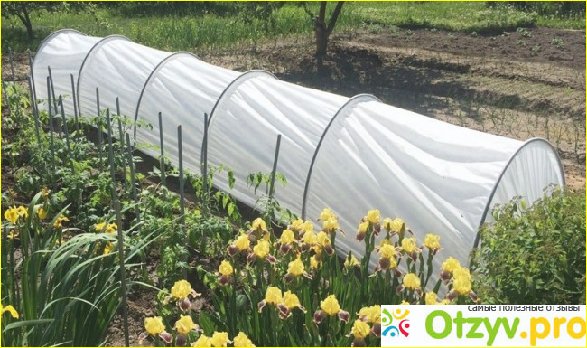 Представляет собой дуги, на которые через равные промежутки нашит материал наподобие целофана. Он свободно ходит по поверхностям опор, можно приподнять один край, проветрить днем. Два конца открытые. Поступать с ними удобно по своему желанию – завязать или прикопать.