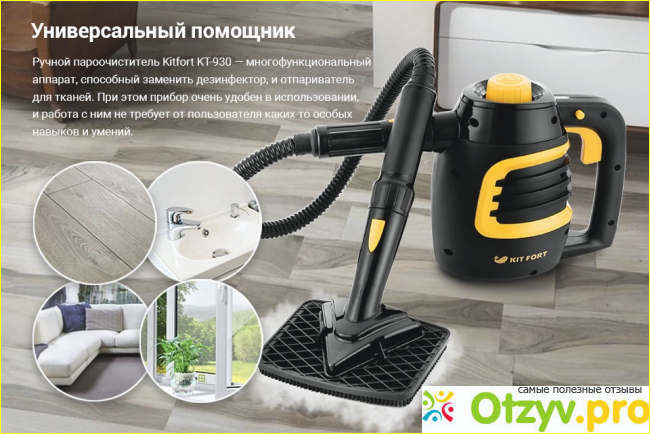 Позже увидала в продаже ручной пароочиститель KITFORT КТ-930, способный заменить дезинфектор и отпариватель для тканей (многофункциональный), а в работе с ним не требуется каких-то особых навыков и умений. Купила за три тысячи сто девяносто девять рублей.
