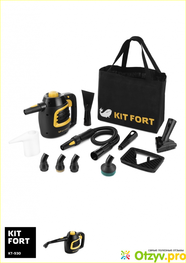 KITFORT КТ-930 упакован в приличную черную сумку с логотипом, а в ней кроме самого аппарата еще множество насадок: съёмный паровой шланг (восемьдесят пять сантиметров), струйная насадка, треугольная ворсовая щётка для пола, насадка на треугольную щётку, круглая ворсовая щётка, две круглых латунных щётки, щётка-скраб, скребок, стакан для воды и руководство по эксплуатации для различных видов уборки и отпаривания.