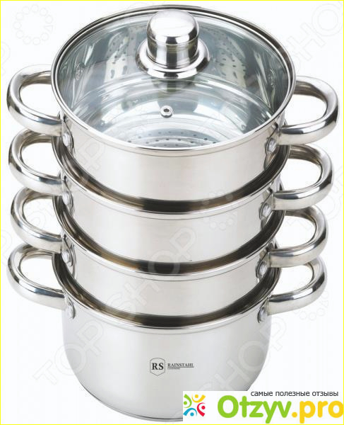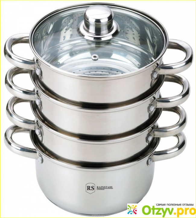Основная комплектация - это собственно пять приборов, также идет в комплекте и крышка с отверстием для выхода пара, при этом вам не надо будет ее снимать, чтобы проследить за процессом приготовления. Сама крышка выполнена из закаленного стекла. Сама же посуда - из нержавеющей стали. Полное антипригарное покрытие. Техника полностью совместима с электрическими, газовыми и стеклокерамическими плитами. Довольно простая конструкция - довольно качественное приготовление блюд. Наши овощи и мясо получаются просто изумительными, при этом они не подгорают и не пересушиваются.