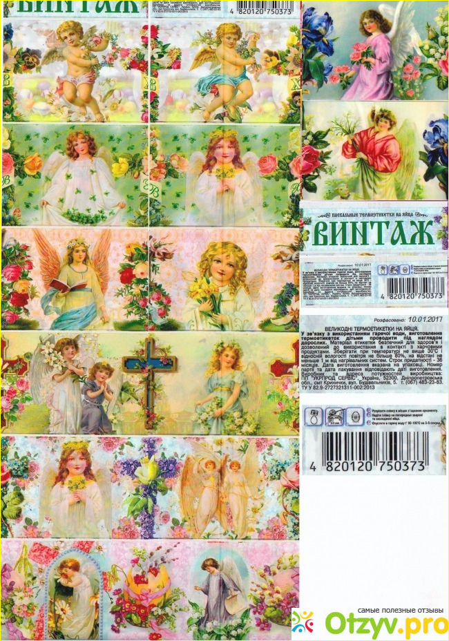 В этом году решила взять термоэтикетки. Выбор их просто огромен. Есть и детские и с прекрасными картинами и церковной тематики. В ленте стандартно 7 штук, только ширина полоски отличается. А вот диаметр у всех одинаковый – в сложенном (плоском) виде – 72 мм. Я взяла четыре штуки разных. Но с «шапочкой» (наименованием, производителем) были только эти. Цена их разнится от точки продажи от 6 до 8 рублей за ленту. Получается, на одно яйцо картинка будет стоить один рубль.