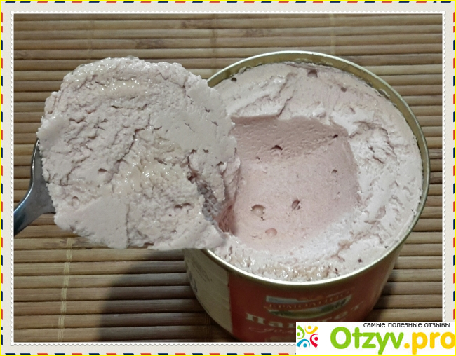 Паштет уложен плотным слоем, жидкости практически нет. Аромат приятный, не насыщенный. Паштет имеет светлый оттенок, значит красителей в нём нет или очень мало.