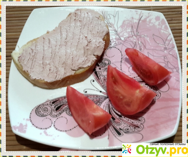 Изготовлен продукт без генно модифицированных организмов. На вкус сытный. Соли положено в меру. Не острый, не жирный, перебора в специях тоже нет. Консистенция нежная, крупинок нет, паштет хорошо ложится на хлеб, на батон.