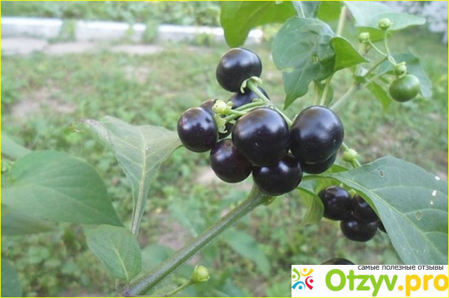 Паслен черный- яркий представитель целого семейства пасленовых, является однолетним растением с темно- зелеными листьями, стеблем, имеющим фиолетовый оттенок и крупными цветками, так же фиолетового цвета. После цветения на растении завязываются целые грозди плодов сине-черного цвета, похожие на крупные бусины.