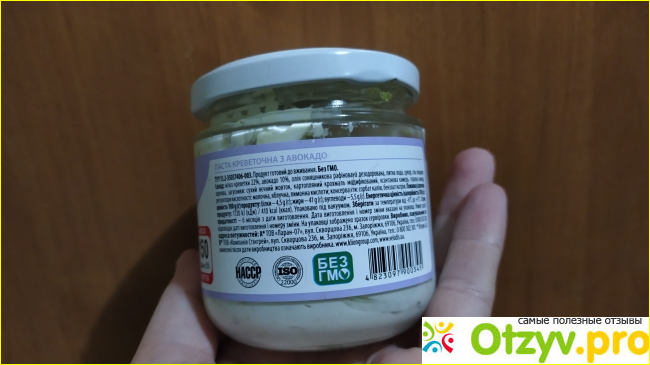 Симпатичная баночка не обманула - ее содержимое было очень приятным на вкус и действительно чувствовались креветки. Изучение этикетки подсказало, что производитель не обошелся без консервантов и вкусовых добавок, но креветки (22%) и авокадо (10%) присутствуют.