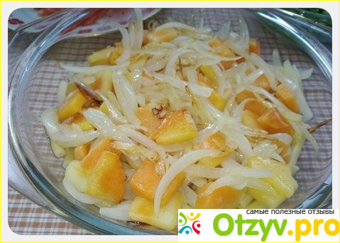 Лук, чеснок нарезаем соломкой и обжариваем на среднем огне в сковороде с подсолнечным маслом, через пару минут добавляем тыкву (предварительно порезанную на кусочки толщиной 3-4миллиметра). Постоянно помешиваем минуты три и засыпаем поверх пасты.