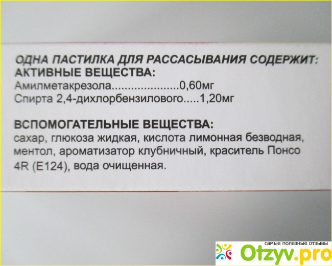 В состав входит активное вещество амилметакрезол (0,6 мг) и спирт 2,4-дихлорбензиловый (1,2 мг). Остальные ингредиенты это вспомогательные вещества: сахар, глюкоза, лимонная кислота, вода, ментол. Вкус и аромат достигается ароматизатором «Клубника» и красителем Понсо 4R.
