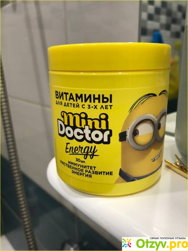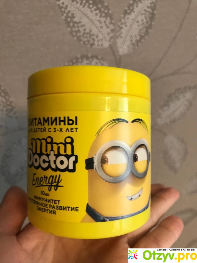 Искала именно подобные жевательные витамины, потому что ребенку постоянно что-то не нравилось и находилось куча причин, почему он не будет пить витамины. Сиропы не подошли, потому что слишком приторные, таблетки, потому что большие, не тот вкус и т. д., оставались только жевательные. В аптеке предложили несколько вариантов, я выбрала Мини Доктор Энерджи, что в принципе логично. Очень яркая баночка, сбалансированный состав, очень простой курс приема - 1 миньон в день. В упаковке 30 миньонов, а значит одной упаковки хватит на целый курс приема. Вкус приятный, малиновый, также порадовал и натуральный ароматизатор. Терпеть не могу термоядерные витамины/конфеты, где максимально химический вкус, тут с этим все ок. Ребенку витамины тоже понравились, что и не удивительно, устоять перед миньонами не каждый сможет. Для поддержания иммунитета в самый раз. Дочка ежедневно сама помнит про приём витамин и ест их с радостью, напоминает каждое утро. Это тоже важно, так как у ребенка форма миньонов вызывает интерес и положительные эмоции.