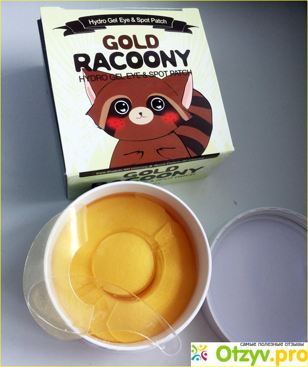 Коробочка, в которой находятся патчи, меня сильно повеселила. Ох уж эти мне енотики)). Запах от патчей не очень интенсивный, но довольно приятный, цветочный. В коробочке всего девяносто штук патчей, из которых шестьдесят штук для глаз, а тридцать - для локального применения. К комплекте идет ложечка. Сами патчи оранжевого цвета с редкими золотистыми вкраплениями.