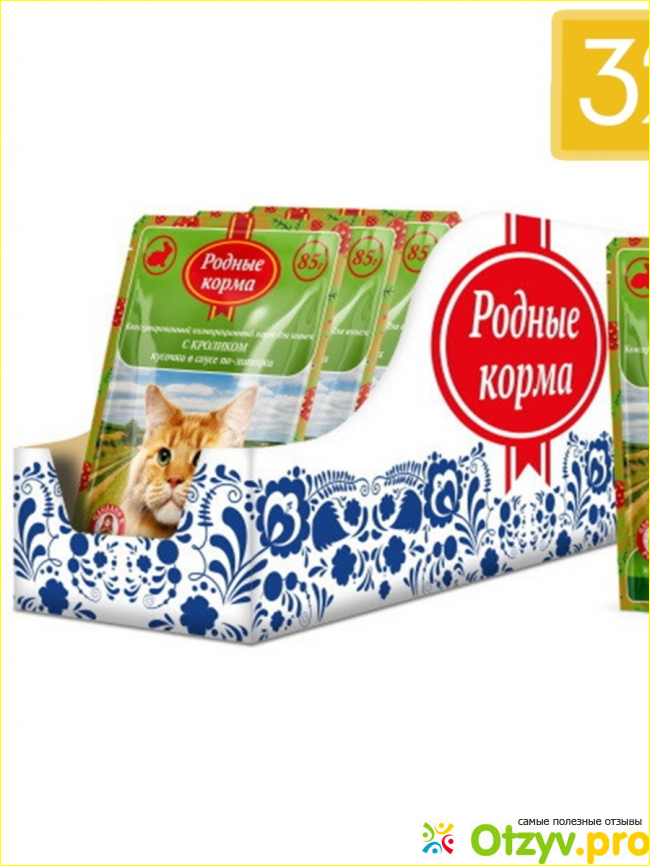 Когда наша кошка Марфуша принесла потомство в количестве четверых котят нужно было их чем-то выкармливать, пока подыскивали им новый дом. И вот тут очень помог влажный корм от бренда "Родные Корма" "Кусочки в соусе по - липецки с кроликом". Состав корма сбалансированный.