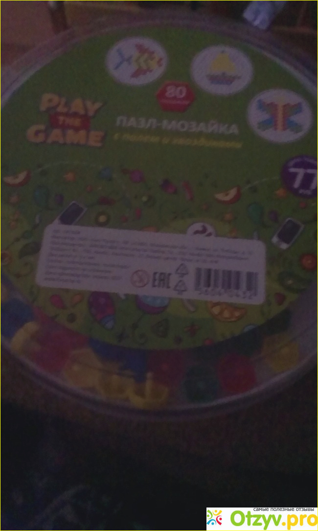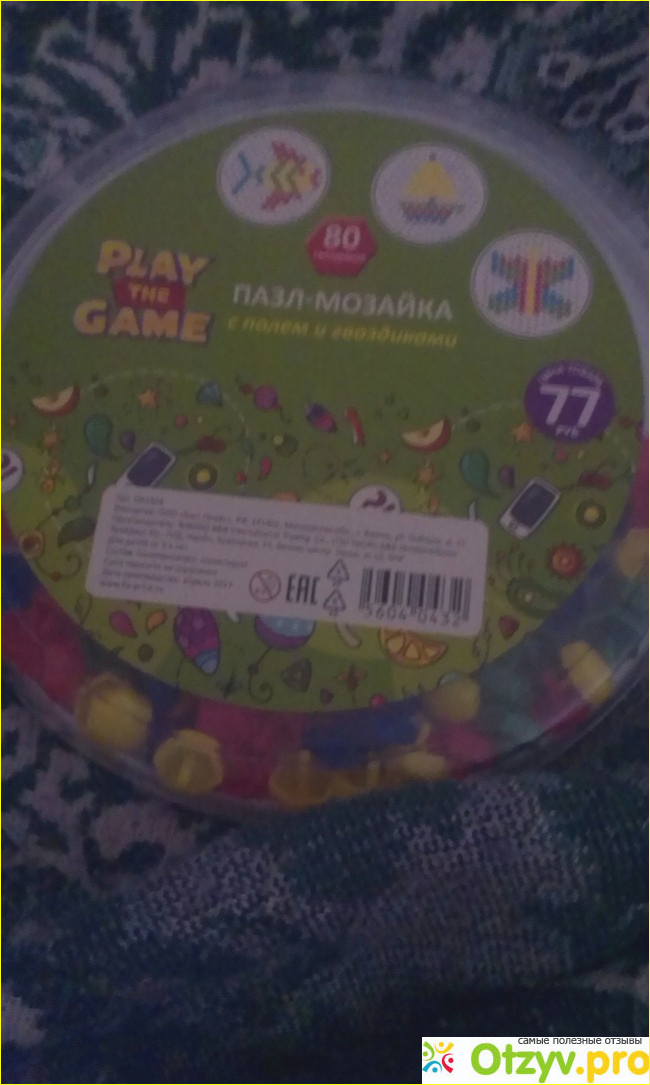 Игра предназначена для детей старше 3 х лет, так как содержит мелкие детали, которые легко можно проглотить. Пазл- мозайка представляет собой игровой набор: поле для игры и гвоздики. Гвоздиков в наборе-80 штук, 4 основных цветов: желтый, красный, синий, зелёный.