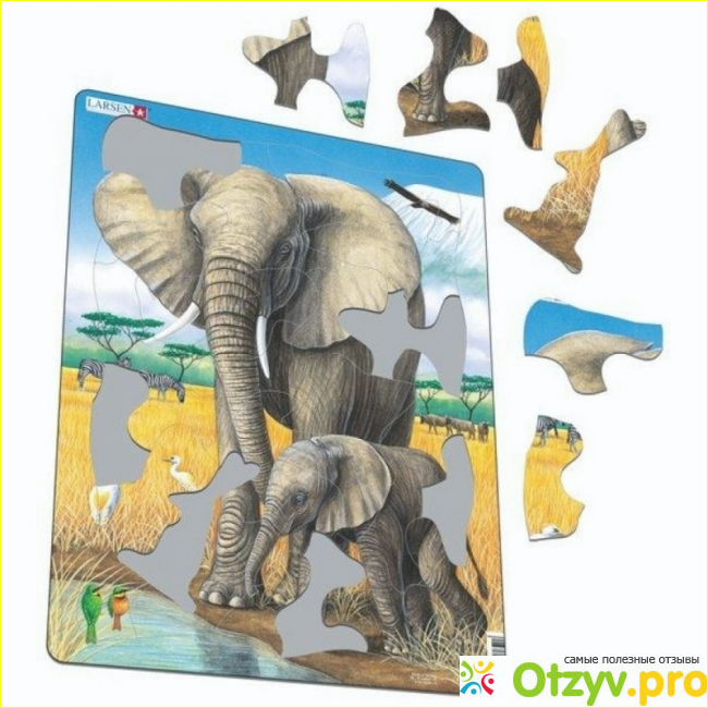 Качество изготовления изделия просто отличное, картинка красивая, интересная. Детали плотные, для того, чтобы их испортить нужно очень постараться. Удобно, что сзади пазла есть дырочки, которые позволяют вытаскивать детали, не испортив их. Ребенка мы учили собирать пазлы Larsen следующим образом: вначале вытаскивали одну деталь, она училась вставлять ее, потом увеличивали количество и так по нарастающей. Поначалу ребенку было тяжело, но очень резко она начала хорошо справляться. Сейчас иногда может собрать пазл из 18 деталей полностью.