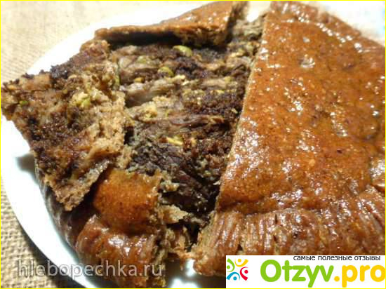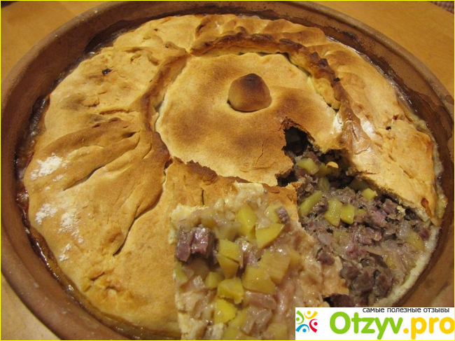 Оставшийся маленький кусок теста раскатать и положить поверх мяса. Защипнуть швы тесто так, чтобы получился котелок с крышкой. Смазать тесто водой и готовить в заранее подготовленной и прогретой духовке при 180 градусах около 50 минут.