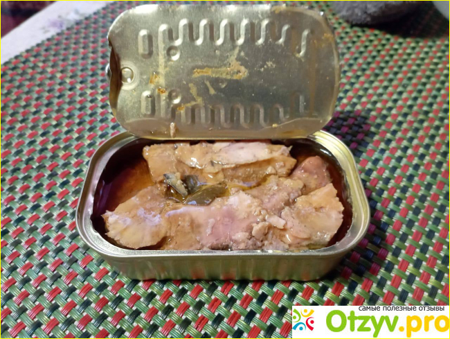 После того, как баночку открыла, удалось убедиться, что состав на упаковке не обманул. Помимо печени внутри конечно если еще и жидкость, но это не масло, которым залит продукт, а по виду и вкусу натуральный рыбий жир. В отличии от того рыбьего жира, которым в детстве нас "пугали", здесь жирок очень вкусный и ароматный. Его я добавила в салат для запаха и вкуса, получилось очень хорошо. Хоть и не очень диетично.