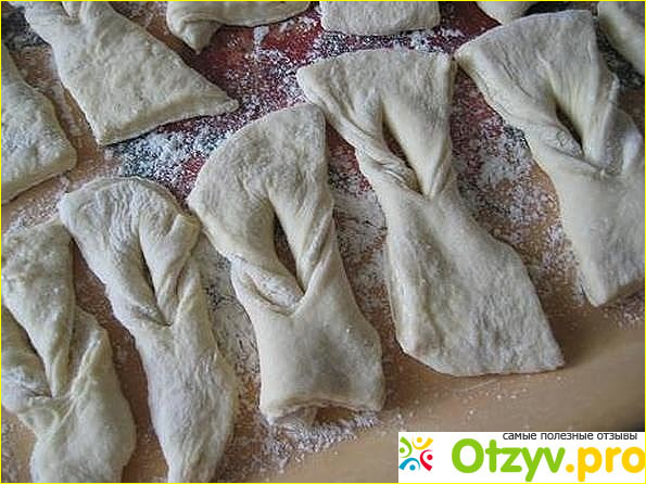 Приготовьте крутое тесто, соединив все ингредиенты рецепта. Раскатайте тесто толщиной 0,5 сантиметра. Разрежьте на одинаковые прямоугольные полоски. В каждой из этих прямоугольников сделайте надрез (не до конца) посредине. Выверните "наружу" концы этих полосок, так как показано на фото.