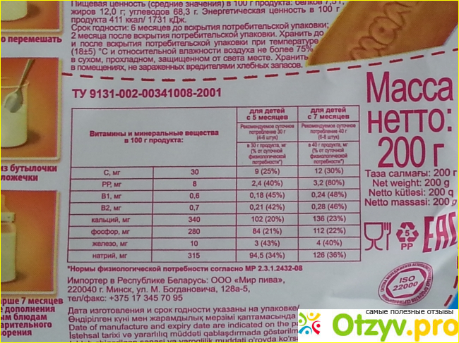 То, что мой глаз правильно упал на Малышок, подтверждалось и информацией о том, что печенье рекомендовано НИИ питания Академии медицинских наук. И состав вполне - с витаминами и только натуральными регуляторами кислотности.