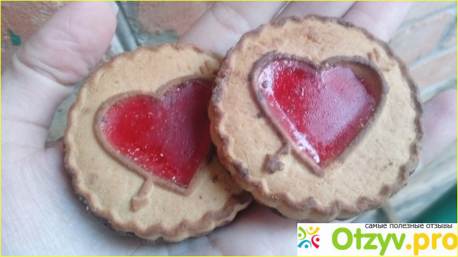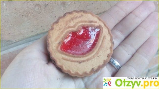 Печенье выглядит очень аппетитно. Сверху миленькие рисуночки из желе, есть в форме губ и сердечек.