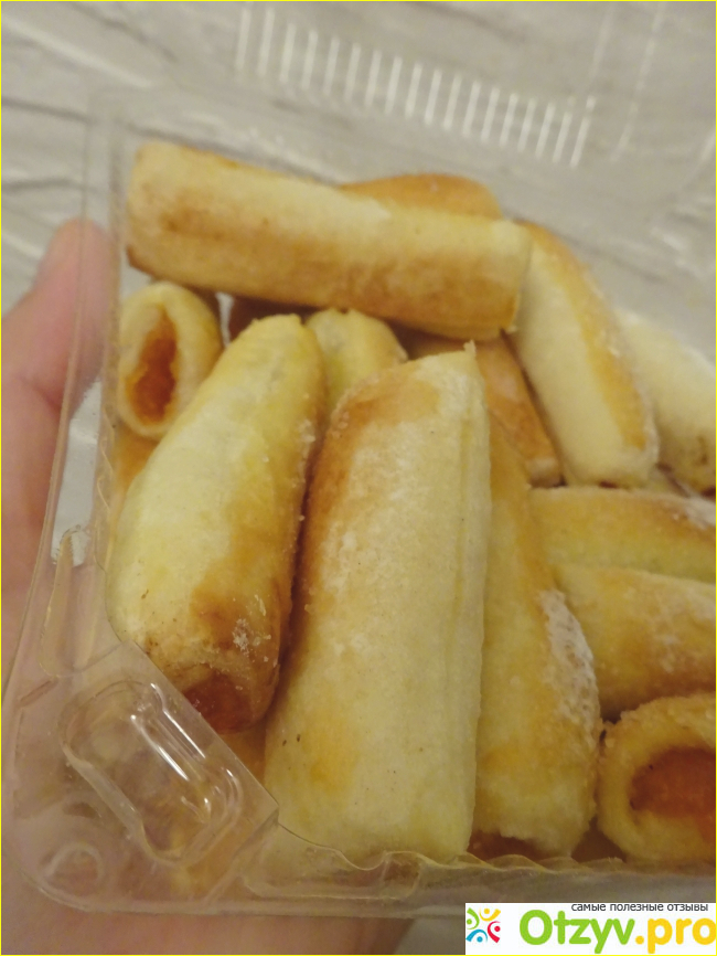 В прозрачной упаковке в виде контейнера с откидной крышкой находились очень привлекательные трубочки с джемом, напоминающие всем известное печенье «Конвертики». Все печеньки имели одинаковый размер, сломанных экземпляров не попадалось. Сверху на упаковке находилась наклейка с информацией о продукте. Состав неидеальный, но и не критический. Как и любое лакомство, выпечка оказалась калорийной, 100 грамм содержат 350 ккал.