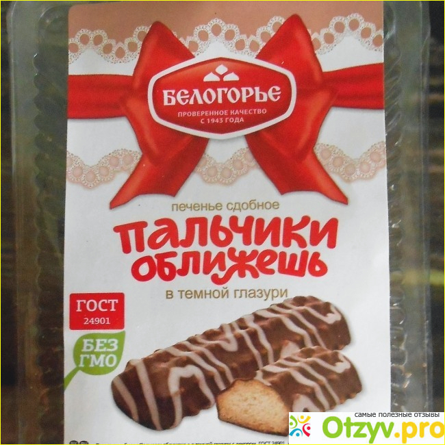 В пластиковом, также прозрачном, контейнере лежали небольшие продолговатые печенья, облитые глазурью из темного шоколада и декорированные полосками белого цвета. Выглядело это довольно аппетитно. Кроме того, на этикетке было достаточно крупно написана аббревиатура ГОСТ, а также указано, что продукт без ГМО. В пачке было 265 г печенья, а «пальчиков» штук 20.