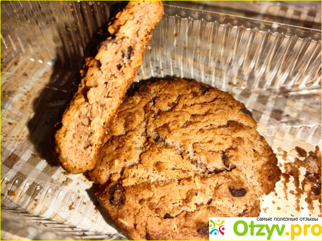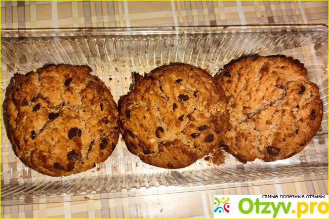 На вид печенье напоминает то, что продают скауты в фильмах. Оно рыхлое коричневое и явно видны крупные кусочки шоколада.