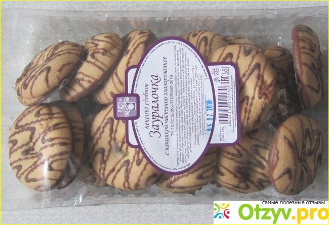 Печенье сдобное "Зауралочка" имеет круглую форму с углублением в центре. Внутри, по кругу, находится начинка из абрикосового пюре. Снизу печенье покрыто шоколадной глазурью, а сверху - этой же глазурью нанесен причудливый рисунок.