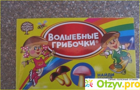 И что мы видим на коробочке, достаточно красочный фон с изображением двух веселых и забавных ребят, и конечно же сами грибочки, с коричневой ирозовой шапочкой, который предлогает нам найти в коробочке производитель и загадать желание.