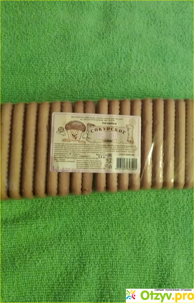 Изготовлено печенье ЗАО "Сокур", расположенное по адресу: Россия, Саратовская область, г. Саратов, Сокурский Тракт. Печенье "Сокурское нежное" изготовлено из муки хлебопекарной высшего сорта, сахарной пудры, маргарина столового (рафинированные дезодорированные растительные масла в натуральном и модифицированном виде, вода, эмульгаторы Е 471, Е 475, соль поваренная, ароматизатор, краситель аннато-куркумин, регулятор кислотности лимонная кислота), яичного порошка, разрыхлителей, а именно: соды питьевой, углеаммонийной соли), соли поваренной, ванилина. Срок годности печенья 3 месяца.