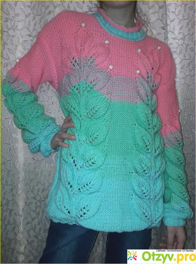 Связала несколько пар и решила связать себе тонкий, тепленький пуловер (очень люблю тонкие вещи), пряжа в работе мне понравилась, да и в носке и в стирке, не вытягивается, не теряет цвет, не закатывается, хорошо, ровно и красиво ложится как в изнаночной так и в лицевой глади.
