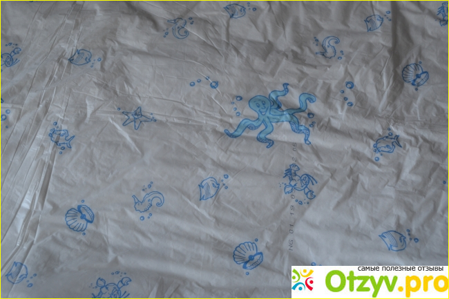 Про оформление. У пелёнок с обратной стороны изображены морские обитатели, что делает привлекательным для ребёнка. И для моей старшей дочери трех лет тоже интересно, она любит их разглядывать.