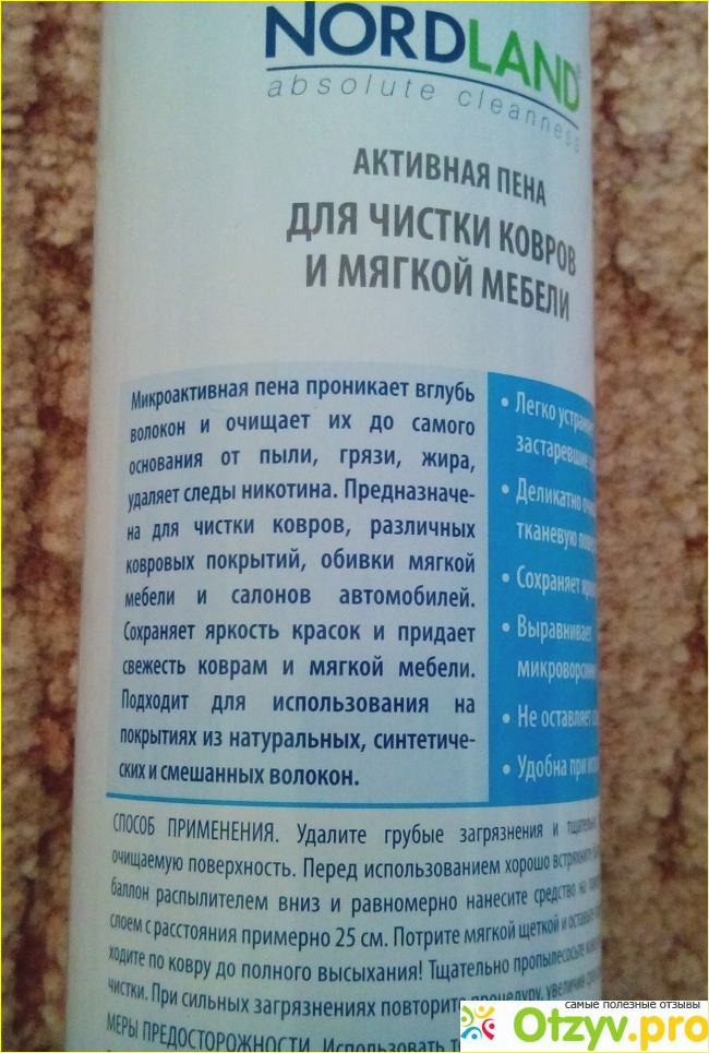 Совсем недавно в гипермаркете "Карусель" я купила активную пену для чистки ковров и мягкой мебели " NordLand".