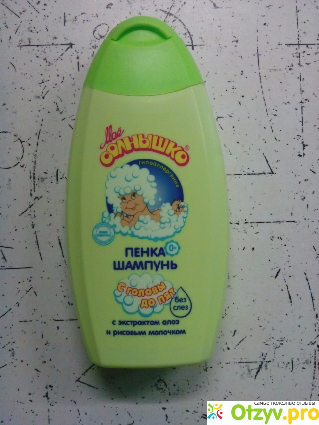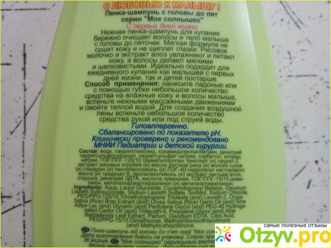 Свой выбор мы остановили на недорогой "Пенке-шампунь с головы до пят" бренда "Мое солнышко". Мы купили средство с экстрактом алоэ и рисовым молочком. Оно позиционирует себя как средство 2 в 1, мы же использовали его только в качестве пены.