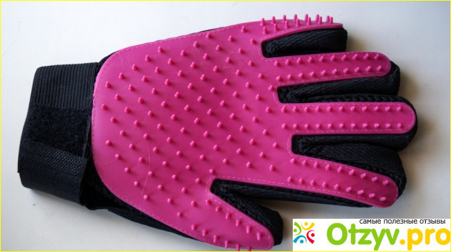 Внешне она выглядит, как обыкновенная перчатка, но продается всего одна на правую или левую руку. Но в отличии от обыкновенной перчатки на её внутренней поверхности имеется специальная резиновая накладка со специальными резиновыми пупырышками (сосками), которые и предназначены для расчесывания и удержания шерсти животного при расчесывании. Эти накладки бывают разных цветов, тут уж дело вкуса каждого. Наружная часть перчатки изготовлена из сетчатой плотной материи, которая способна защитить вашу руку от укуса или царапания Вашего домашнего животного. Перчатка фиксируется на вашей руке при помощи специальной застежки липучки, это очень удобно. В целом на руке она сидит довольно удобно, но надо знать, что на большую мужскую руку она может быть и маловата.