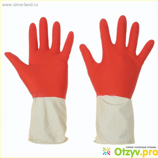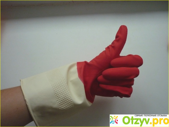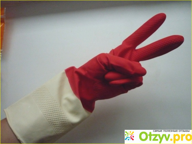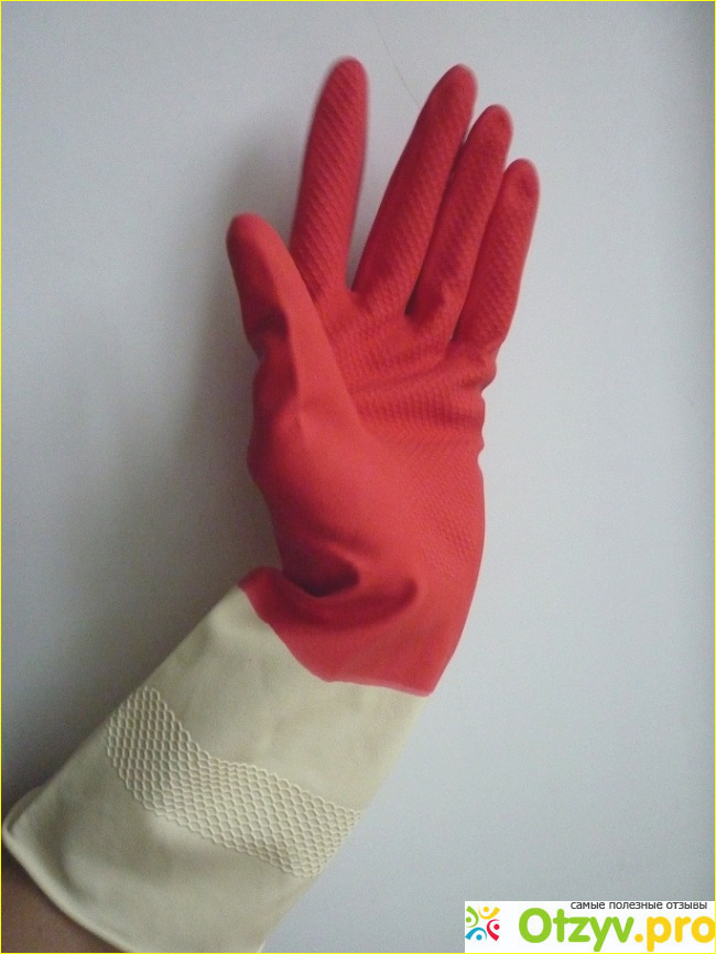 Резиновые перчатки сделаны из прочной резины. Они красного цвета, а заканчиваются белым. Перчатки продолговатые, удобно тем, что когда поласкаешь тряпку, вода не попадает в перчатки.