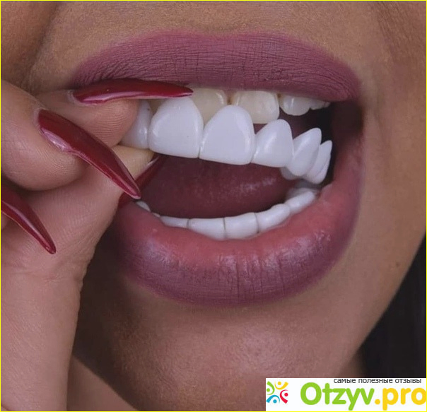 Держится плотно, еле отодрала обратно, но выглядит вовсе не так красиво, как на фотке. К самому изделию претензий нет - белоснежные зубки выглядят замечательно. Чисто, красиво, ухоженно. Только вот ко мне, моей челюсти совершенно не подходят. Видно, десневая часть у меня небольшая, а потому виниры располагаются намного ниже моих зубов.