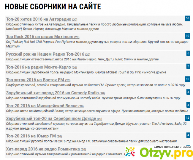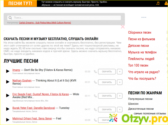 В верхней части сайта расположена поисковая строка для быстрого поиска любой песни, которую вы хотите послушать или скачать. Чуть ниже предложен список лучших песен, которые популярный среди слушателей и исходя из ротаций различных радиостанций. Их можно послушать, скачать или добавить в свой плейлист.