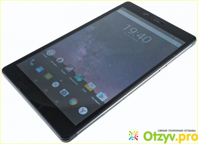 При включении, сразу видно его цветопередача, картинка красивая, естественная, сочная, что разует и это обеспечивает его разрешение экрана, которое составляет 1280 х 720 пикселей. Конечно же меня в нём очень радовали углы обзора, которые совершенно не меняют картинку под любым углом, не искажают её, что важно при просмотре видео и даже фильмов. Работает он на четырёх ядерном процессоре, установлена операционная система Андроид 6.0, в работе себя проявил хорошо, никогда ничего не подвисало и не глючило. На касания реагирует быстро, сенсор поддерживает одновременно пять касаний. Порадовало и то, что можно дополнительно пользоваться им, как смартфоном, потому как имеет девайс два слота под сим-карты, но только единственный момент и он состоит в том, что второй слот комбинированный, подразумевает использование либо второй сим-карты, либо карты памяти, но так, как это планшет, то проблем я в этом не вижу.