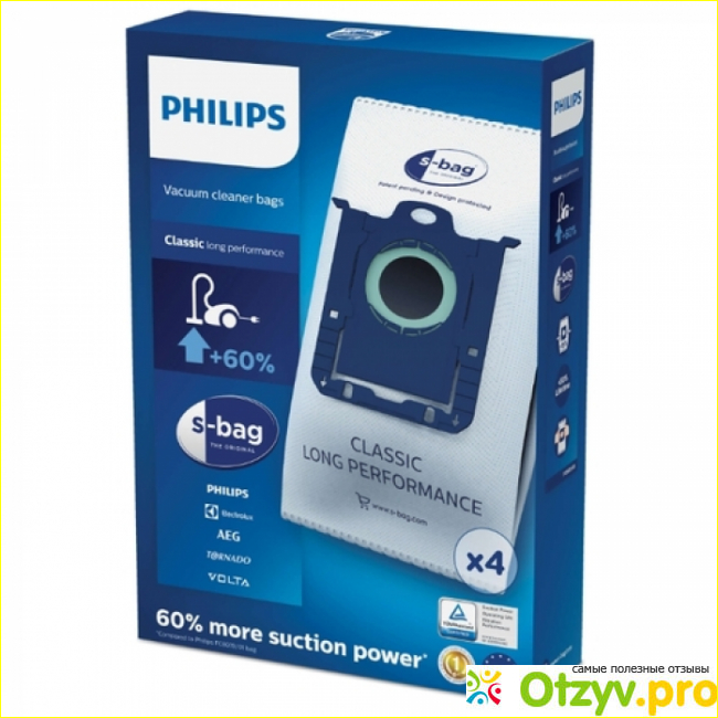 Производитель запатентовал специальную систему закрытия мешка Philips s-bag. Благодаря этой системе мешок легко извлекается. Можно не опасаться, что мусор просыпется наружу или разорвёт стенки мешка.
