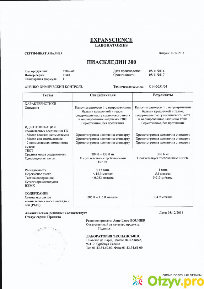 Я же, в свою очередь, присоединяюсь к положительному мнению относительно эффективности препарата Пиаскледин 300, так как проверила его действие на себе. И хотя препарат безумно дорогой, а действие его медленное, о потраченных деньгах не думаешь, когда хочешь вылечиться, поэтому я с полной уверенностью рекомендую препарат Пиаскледин 300 больным страдающим, данными видами недомогания. Но только перед приемом обязательно внимательно изучите инструкцию, проверьте свою индивидуальную переносимость к данному препарату и непременно проконсультируйтесь с профессиональным врачом!!!